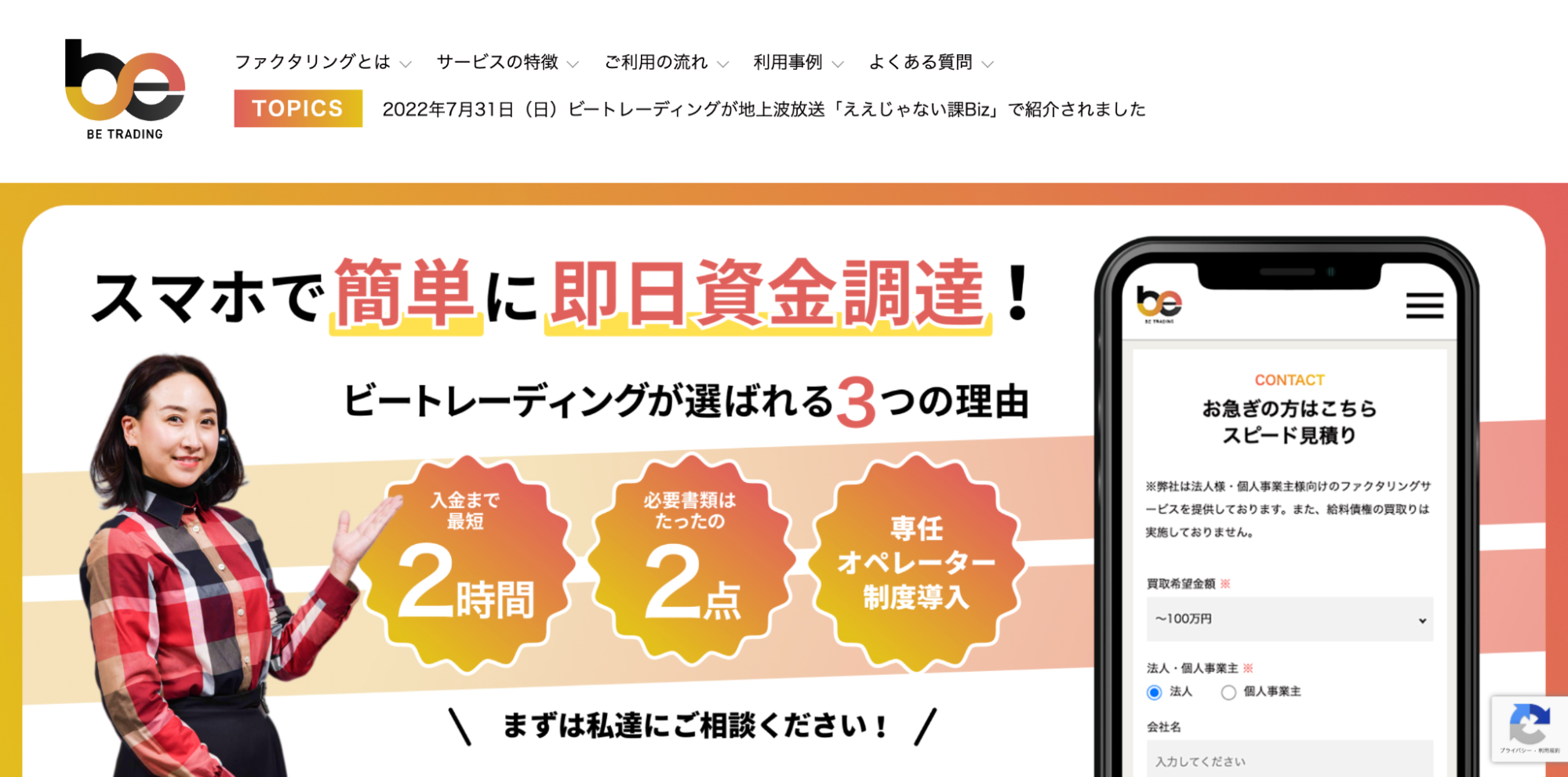 ビートレーディングは、業界トップクラスの取引実績を誇るファクタリング会社です。スマートフォンから簡単に手続き可能で、必要書類は2点のみでスピーディーに資金調達が可能です。