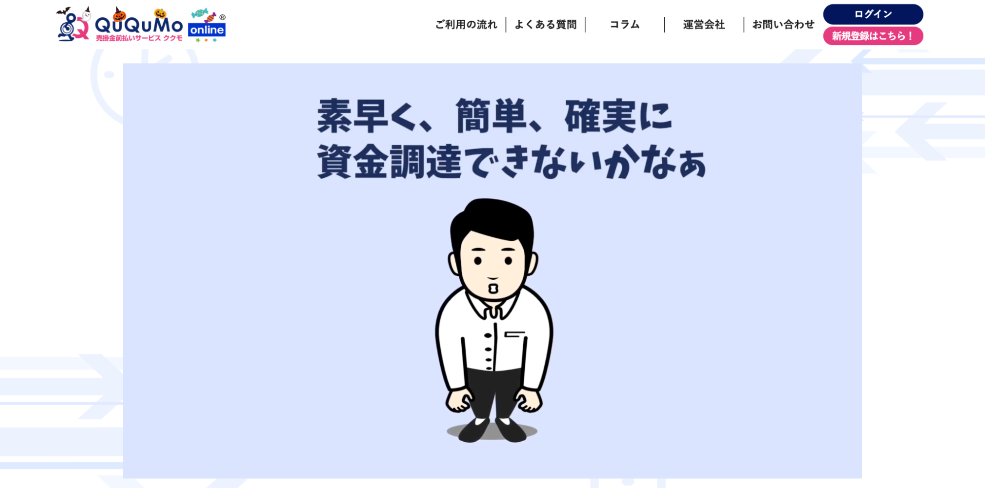 QuQuMo(ククモ)は完全オンライン完結型サービスで知られる会社です。審査工程が簡略で、手続きも少ないのが強みで、必要な書類も請求書と通帳の2点なので、実績の少ない個人事業主でも少額・高額関係なく利用できます。