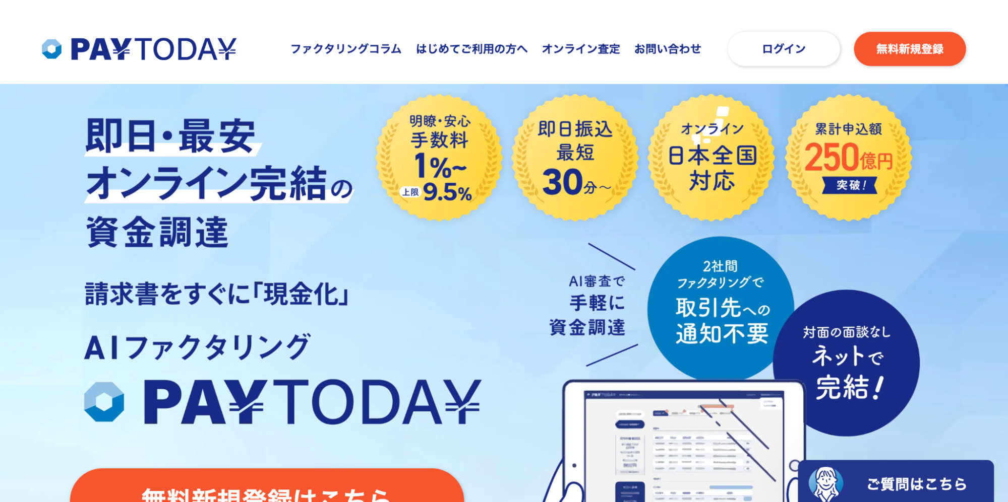 | PAYTODAY | 2社間 | 1%〜9.5% | 最短30分 | 10万円〜上限なし | PAYTODAY公式HP |