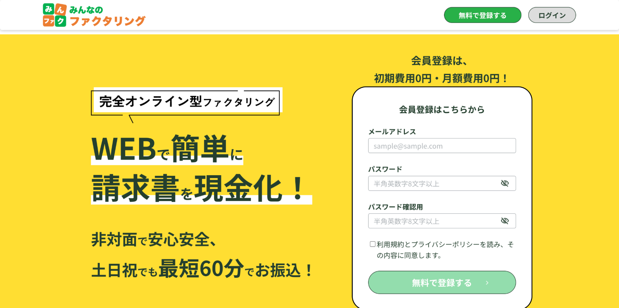 | みんなのファクタリング | 2社間 | 無料 | 最短60分 | 1万円〜300万円 | みんなのファクタリング公式HP |