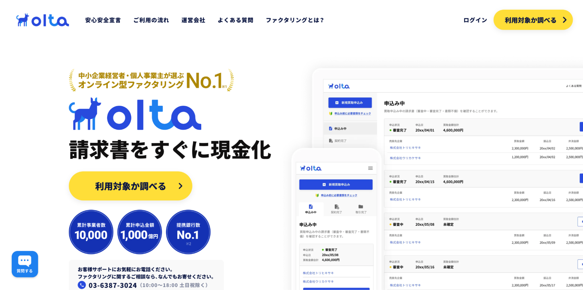 中小企業や個人事業者向けサービスを提供しているOLTAでは、手数料が2%〜と安く、最短即日での入金が可能です。提出書類も少なく、審査も比較的通りやすいのでフリーランスの方も多く利用しています。