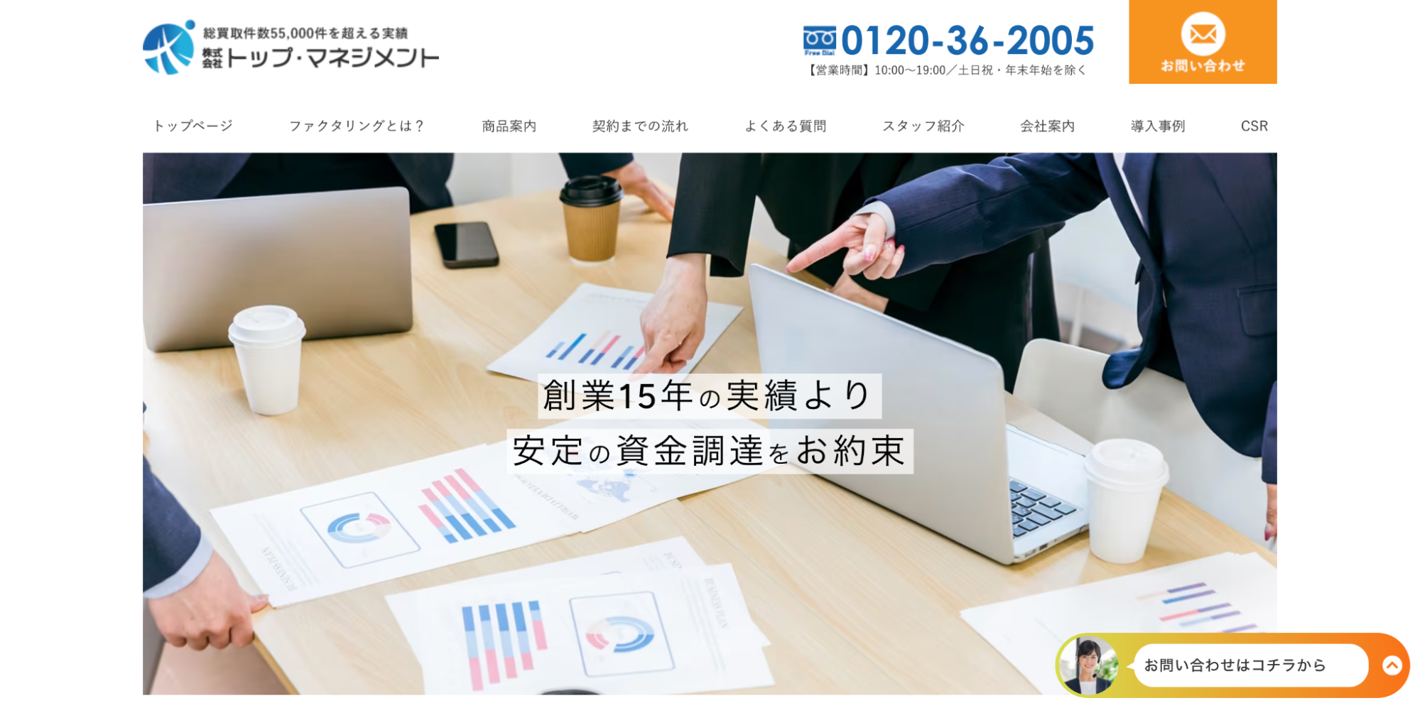 | トップ・マネジメント | 2社間・3社間 | 0.5%〜12.5% | 最短即日 | 〜1億円 | トップ・マネジメント公式HP |