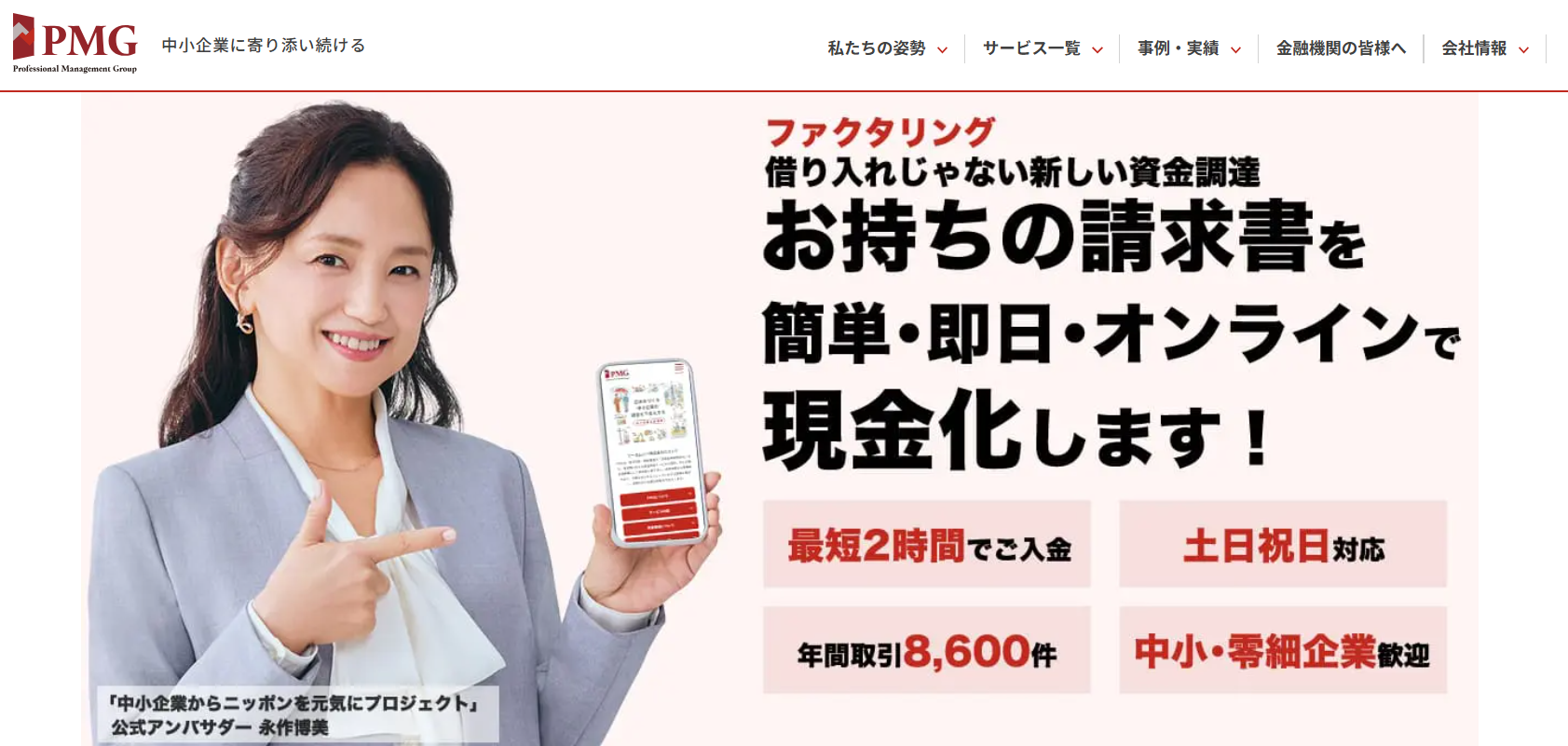 土日祝もファクタリングの相談が可能なPMGは、年間の取引実績が8,600件と豊富なファクタリング会社です。最短2時間で入金してもらえるだけでなく、最適な資金調達の方法もアドバイスしてもらえます。